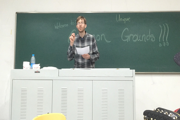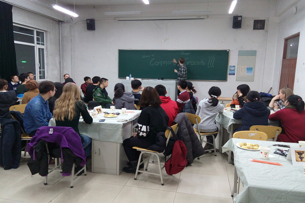 主持人Luke致辞讲话,同学们和外教随机抽取座位并一起做简单有趣的文字游戏,活动全程用英语交流。游戏过后,大家围坐在一起喝咖啡品尝点心,并围绕一个主题交流自己的看法和意见。外教和同学们自由讲话,谈话进行得十分愉快。