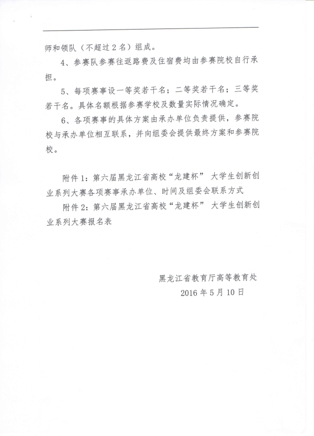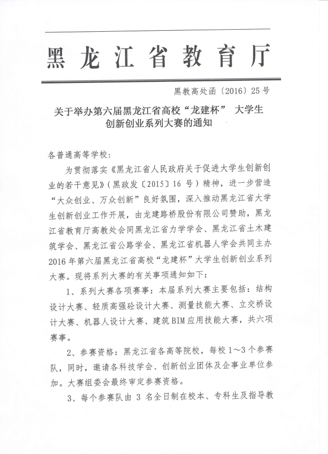 近日,教育厅下发了《关于举办第六届黑龙江省高校“龙建杯”大学生创新创业系列大赛的通知》,请各院系积极组织参与,有意愿参加的同学积极准备,后附通知内容及附件。
