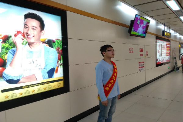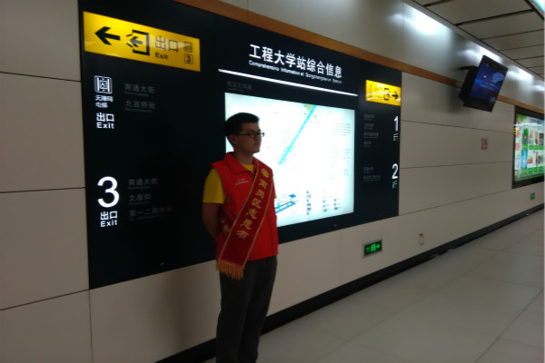 小红帽志愿服务队准时来到哈尔滨地铁工程大学站,在与值班站长进行简单交流后,搬桌子来到地铁站的地下一层中心位置,正式开展本次志愿活动。一行四人分别站在不同的岗位上,为乘客们提供服务。郝子啸站在出口处,组织出口乘客的纪律,保障地铁交通有序进行;李桐站在中心位置,为有疑问的乘客联系地铁工作人员,解决问题;劳铁涛和王震源站在地铁出口的地图旁,为不知方向的乘客指路。