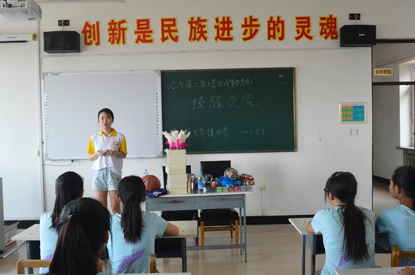 在简要自我介绍后,实践队队员提问同学们对哈尔滨工程大学的了解和认识。有所了解的同学积极发言。学生会副主席孙雨宣详细介绍学校历史、文化、校园风景等信息并对经济管理学院做简单介绍,让他们对哈工程有更多的了解。每位队员分享自己的学习成长经历,鼓励他们努力学习,树立人生目标。在答疑环节,同学们就学习和生活等方面提出疑问,服务团队耐心地解答,并做出指导。