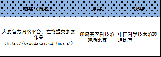 (三)初赛阶段:2016年7月-10月。各中、高院校团委组织动员在校学生广泛开展科普实验及创新活动,并将参赛作品、参赛选手信息等上传到中国数字科技馆网站上的大赛官方网络平台,大赛评审委员会组织专家对参赛作品进行评审,确定并公布复赛名单。