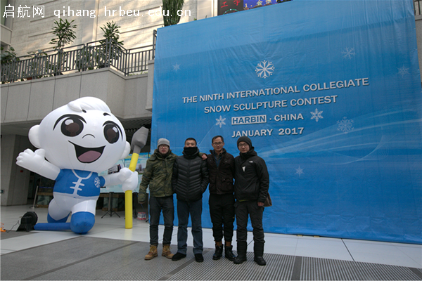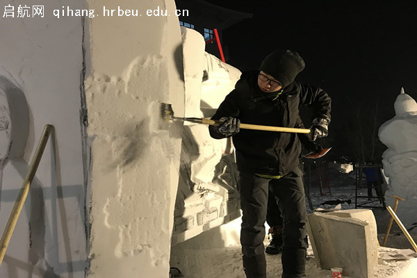 这幅“长征”雪雕作品的创作者是来自中国美术学院的四位大四学生,对于组队准备这样的问题,其实他们自己也挺意外的,几个人都是同一个班的,当时知道有这个比赛后就想来尝试一下,但是一直没有找到合适的主题,直到报名最后一天,才匆忙地把这个作品交上去,结果还真的被选中了,这才有了踏上北国之旅的机会。能来到这样北国以北的地方,他们觉得自己还是很幸运的。四位同学都是第一次来到哈工程,也是第一次来参加雪雕大赛,在他们看来,哈工程这样的工科学校与他们艺术类院校的氛围还是有很大不同的,他们自由开放,这里相比之下更加严谨认真,这样的学校环境让他们更加坚定了自己创作的目标,要全身心投入进去,认真做好每一件事。
