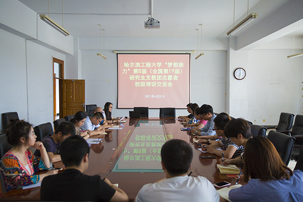 6月21日16时,哈尔滨工程大学“梦想接力”第8届研究生支教团志愿者校级培训交流会于主楼522室举办。校团委书记史波、副书记朱黎黎、组织部部长贾刚、学生兼职副书记刘敏、研究生支教团团长马松及我校第8届研究生支教团成员参加本次会议,贾刚主持会议。