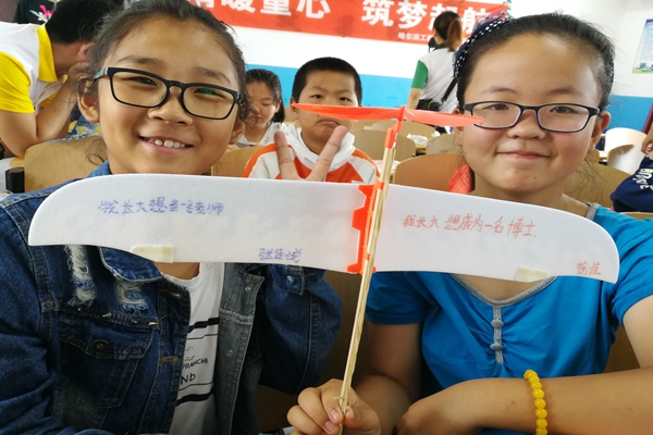 同学们被分为两人一组,志愿者们分发材料包。志愿者陈震、朱博远向同学们演示橡皮筋动力飞机的组装过程及飞行原理。孩子们跟随演示的过程动手实践。“将飞机机翼插入木制骨架”“再插上螺旋桨”……“最后用橡皮筋连接螺旋桨与尾翼骨架”,十多步并不简单的制作过程逐一完成。18组飞机模型完成后,同学们将做好的飞机模型翻转过来,在飞机两翼上写下了自己未来的心愿,并在志愿者的引领下,来到了操场上一起放飞飞机。随着微心愿飞机的起飞,孩子们的梦想也一同展翅翱翔。