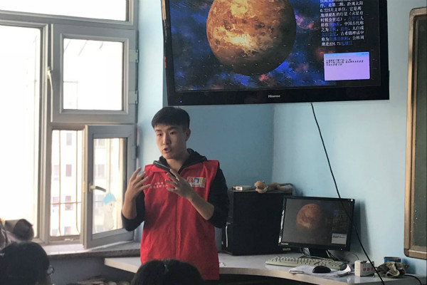 韩兆亮,李昌恩,崔博文三人分别向听课的同学们介绍宇宙和船舶知识。崔博文利用视频介绍太阳系的构成以及星球中的物质,跟同学们探讨生命的起源。同学们纷纷发言,现场气氛十分热烈。李昌恩以海洋生物、海洋发展与海洋生态多方面展开讲述,播放海洋生物记录片,介绍多张多样的海洋生物,海洋科普完美进行。韩兆亮从载人潜器英雄叶聪引入船舶潜器行业,介绍潜艇潜器的分类、潜艇的下潜原理等。