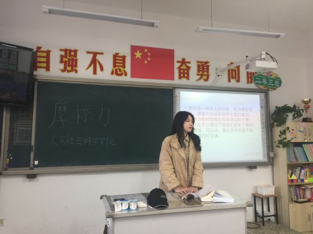 活动伊始,周俊辰为同学们讲解了关摩擦力张的题,向同学们提出问题并给予奖励,调动同学们对科学知识的兴趣;然后,周俊辰为学生详细讲解了摩擦力的相关知识,并将两本书重叠放在一起体验摩擦力,让同学们体验到日常生活中摩擦力,以便于同学们对摩擦力进一步了解;最后,周俊辰为同学们讲述了关于生活中的摩擦力。