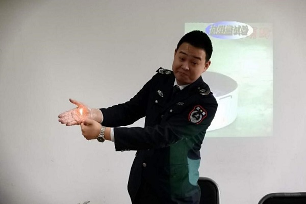 吕恩炀向参加人员介绍了消防责任制、火灾类型、常见火灾隐患、火灾扑救、逃生方法等火灾知识,并向大家讲解了家庭及单位常见火灾与应对方法,火灾常见的知识误区与正确措施,根据讲解内容详细分析了若干火灾案例。同时,吕恩炀就消防器材的分类和正确使用进行了讲解与示范,除常见的干粉灭火器之外,吕恩炀演示了更为安全高效的水基型灭火器的使用,该灭火器可瞬间蒸发火场大量的热量,迅速降低火场温度,抑制热辐射,隔离氧气,具有降温、隔离双重作用,另外还详细演示了火灾面具,破窗器等消防器材的使用。