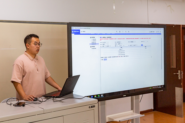 张丙辛向在场学生助管说明图书馆打印机的使用方法,介绍外借器材申请和值班人员签到等事项,讲解教室申请、启航网新闻发布等工作的流程。史佳卿介绍网上预约报账系统的使用方法,说明网上预约报账的具体流程及注意事项,并着重讲解付款的方式、步骤以及公共卡消费认证的相关事宜。