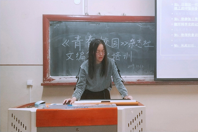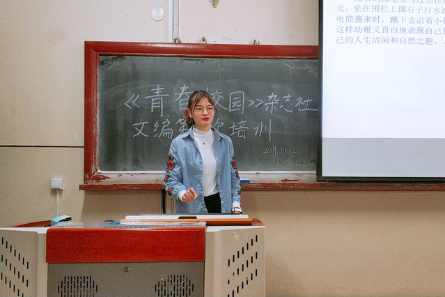 10月12日,校《青春校园》杂志社于11号楼0135教室举办2019秋季学期文编第一次培训。校《青春校园》杂志社副主编吴毓荻担任本次活动负责人,欣赏部长孙俊彦、人物部长吴毓荻担任活动主讲人。校《青春校园》杂志社文编部分成员参加本次培训。