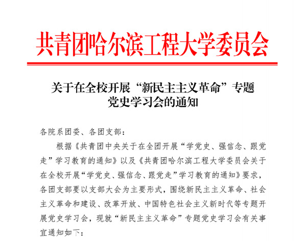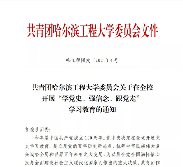 为深入学习贯彻习近平总书记在党史学习教育动员大会上的重要讲话精神,引导广大团员青年厚植爱党、爱国、爱社会主义的情感,让红色基因、革命薪火代代传承,共青团哈尔滨工程大学委员会认真落实团中央部署和要求,紧扣立德树人根本任务,以“四个结合”为抓手,引导全校师生党员做到学史明理、学史增信、学史崇德、学史力行,推动党史学习教育走深走实,并制定了《共青团哈尔滨工程大学委员会关于在全校开展“学党史、强信念、跟党走”学习教育的通知》,高质量推进党史学习教育。
