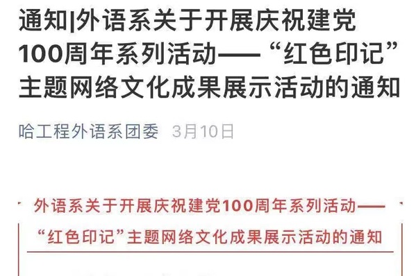 7.外语系团委开展庆祝建党100周年系列活动——“红色印记”主题网络文化成果展示活动。创新党史教育学习方式,推动线上线下联动学,团员青年比拼学,让同学们在丰富的主题活动中”学党史,知党恩,跟党走”,引导团员青年进一步发扬革命精神,赓续精神血脉。
