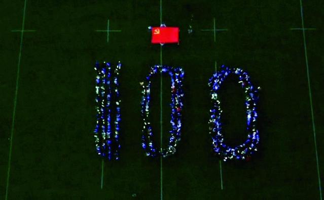 在夜幕下的操场,800名学子手握荧光棒,在尽情奔跑的途中,接受党史问答挑战,于奔跑中体会建党百年历程中的艰辛与荣耀。夜跑结束后,同学们纷纷将获得的荧光五角星贴在展板上,点亮“1921-2021”字样。随后,同学们列出“100”的巨型方阵,点亮党旗,庆祝建党一百周年。“当年中国共产党的成立照亮了中国,我们在这个特别的日子照亮夜空,表明我们追随党继续向前,扬帆起航的决心。”动力学院2019级本科生杨依梦说。