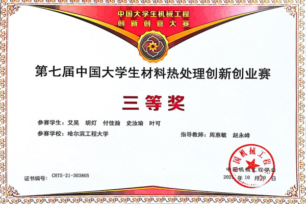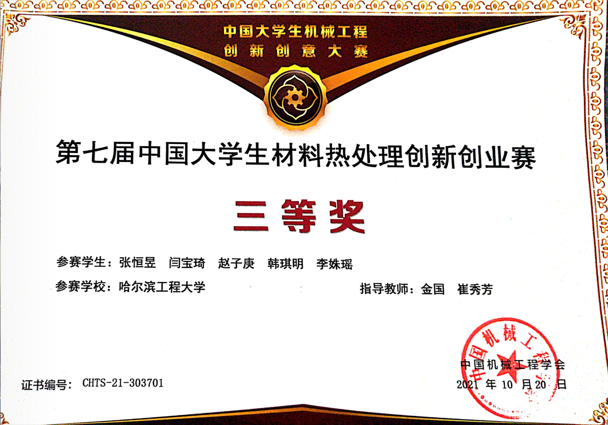 由金国老师、崔秀芳老师、阿力木江老师共同指导,本科生张恒昱、闫宝琦、赵子庚、韩琪明、李姝瑶申报的《面向重载荷冲击传动齿轮的符合热处理技术》,荣获大赛全国三等奖;