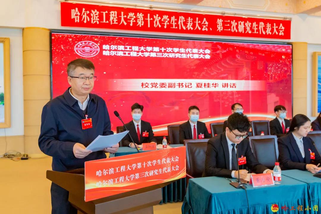 校党委副书记夏桂华在会议中讲话。他首先对哈尔滨工程大学第十次学生代表大会、第三次研究生代表大会的召开表示祝贺,指出在学校党委的坚强领导下,在上级学联和校团委的具体指导下,我校学生会、研究生会坚持以习近平新时代中国特色社会主义思想为指引,以保持和增强政治性、先进性、群众性为目标,以服务同学为宗旨,坚持围绕中心、服务大局,在思想引领、权益维护、成长发展、创新创业、改革建设等方面继承传统、开拓创新,开展符合学校特点、适合同学要求的活动,团结、引导和带领广大学生全面发展,积极稳步推进学生会组织改革进程,并提出站在伟大的中国共产党成立100周年这样的历史时刻,学生会、研究生会要带领广大同学深入学习领会习近平总书记“七一”重要讲话精神和党的十九届六中全会精神,以实现中华民族伟大复兴为己任,把个人价值实现融入全面建设社会主义现代化国家新征程的大局之中。学生会、研究生会要积极主动作为,带领广大学生,以高度的政治责任感和历史使命感,助力学校“双一流”建设和“十四五”发展的新篇章。同时他代表学校党委就做好新时代学生会、研究生会工作提出三点希望: