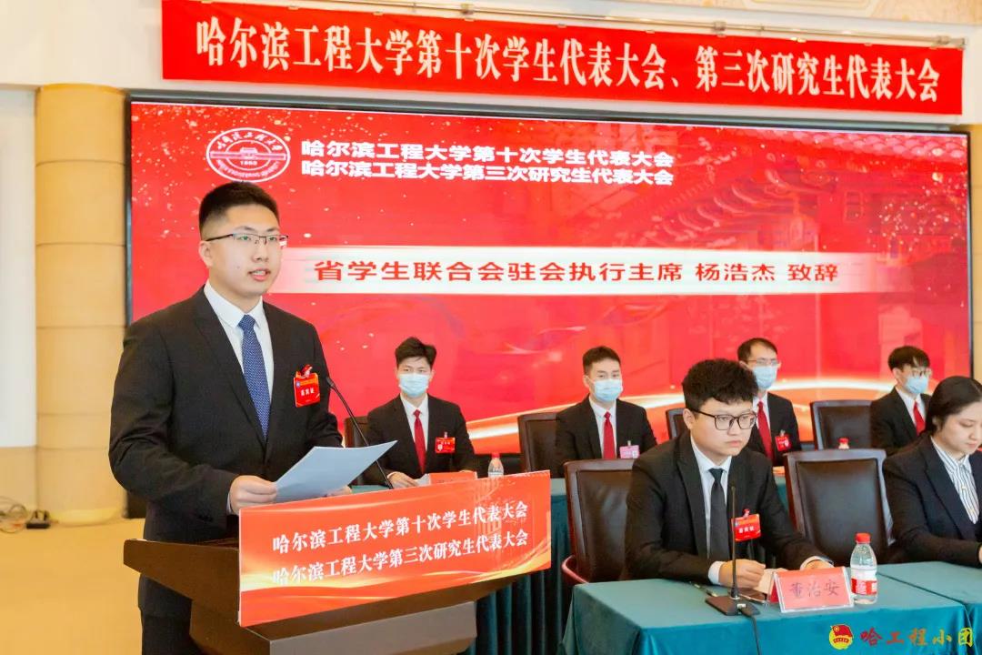 黑龙江省学生联合会驻会执行主席杨浩杰在会议中致辞。杨浩杰代表黑龙江省学生联合会对大会的召开表示祝贺,对哈尔滨工程大学学生会的工作做出充分肯定,并提出三点想法: