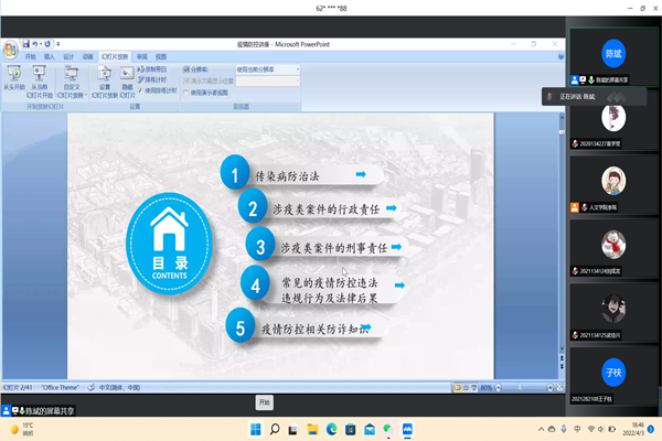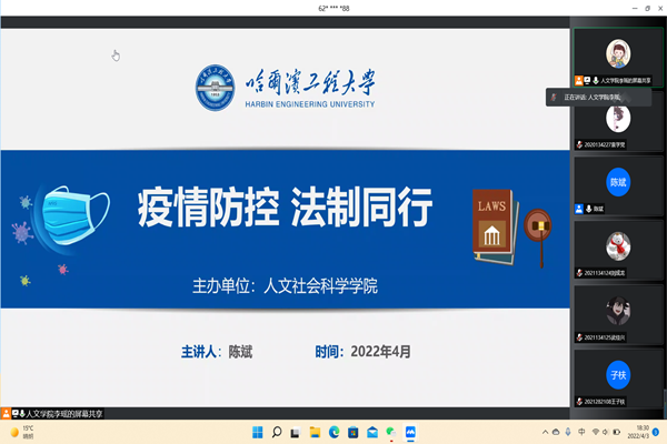 为顺利迎接党的二十大,庆祝中国共青团成立100周年,同时为引导广大师生深入了解疫情防控工作有关法律知识,增强师生的疫情防控法治意识,促进疫情防控工作依法有序开展,4月3日晚,人文学院组织开展“疫情防控,法治同行”线上普法讲座。人文社会科学学院法学系教师陈斌受邀担任主讲人,人文学院团委书记李瑶担任主持人,人文社会科学学院、计算机科学与技术学院、机电工程学院、南安普顿海洋工程联合学院、未来技术学院部分学生参与讲座。