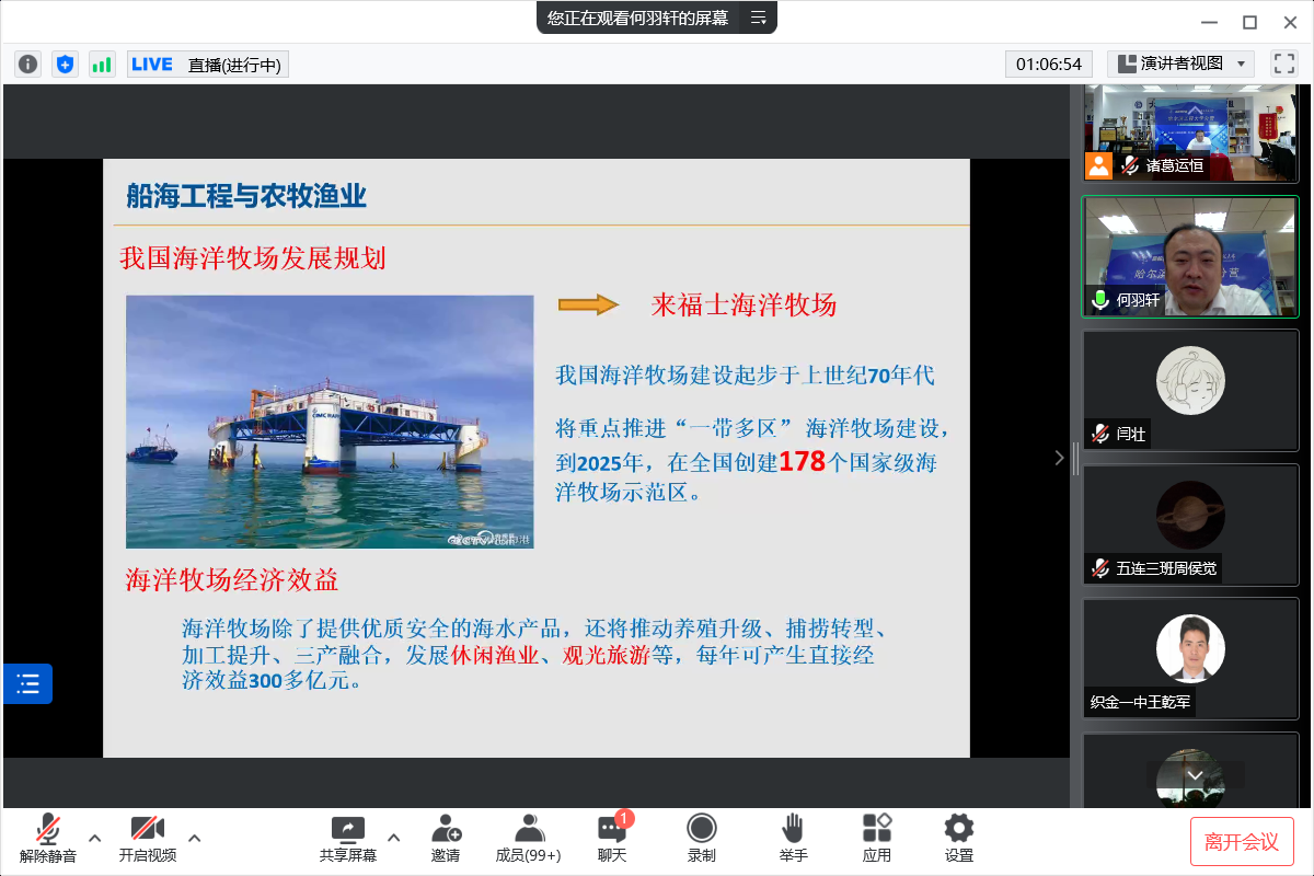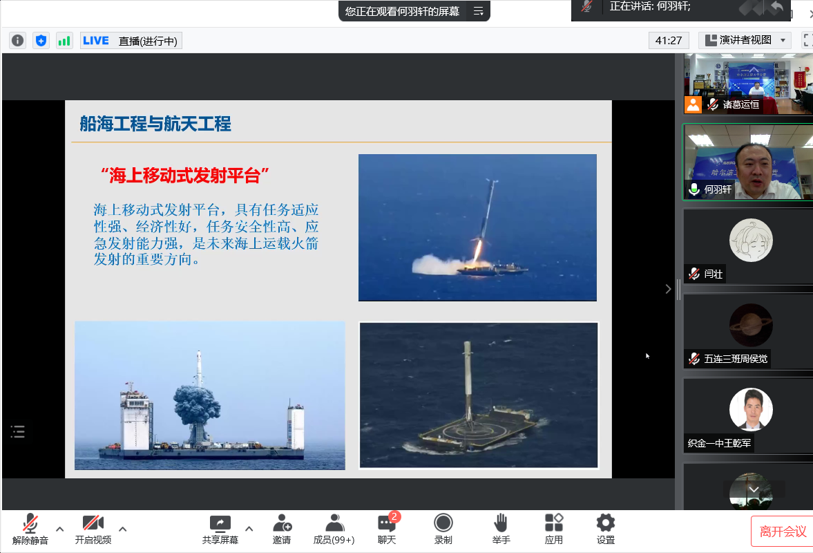 讲座伊始,郭君老师向营员们着重介绍了航海工程与航天工程的结合方式,列出了火箭由海上发射的优势,和营员们探讨了海上发射平台的关键技术,针对航海工程与农牧渔业,郭君老师为营员们概述了海洋牧场的概念,带领营员们认识了我国大型海洋养殖船,了解了海洋牧场的关键技术。最后,郭君老师用古人成功成才的“六字真言”对营员们进行勉励。