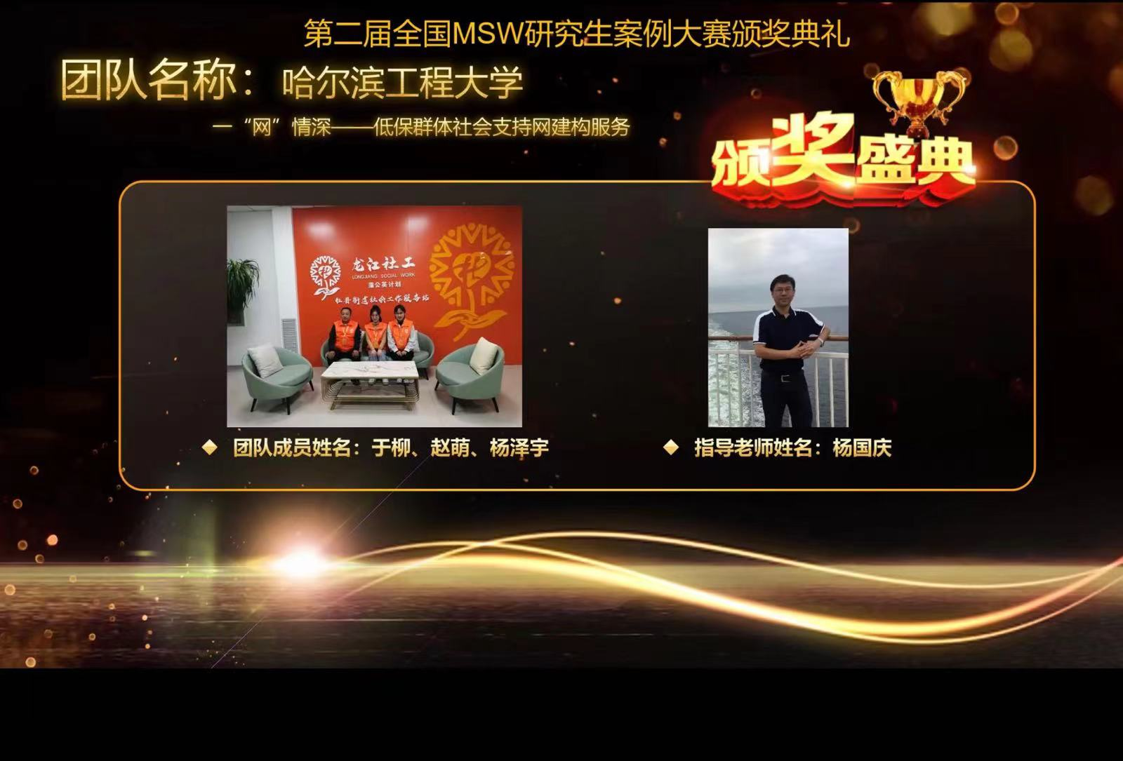 第二届全国MSW研究生案例大赛决赛于近日在线上举行。决赛采用线上评审和答辩的方式,来自全国不同高校的36支队伍进行了评选。经过激烈角逐,我校人文社会科学学院杨国庆教授指导的《一“网”情深--低保群体社会支持网络构建服务》实践案例荣获全国三等奖。