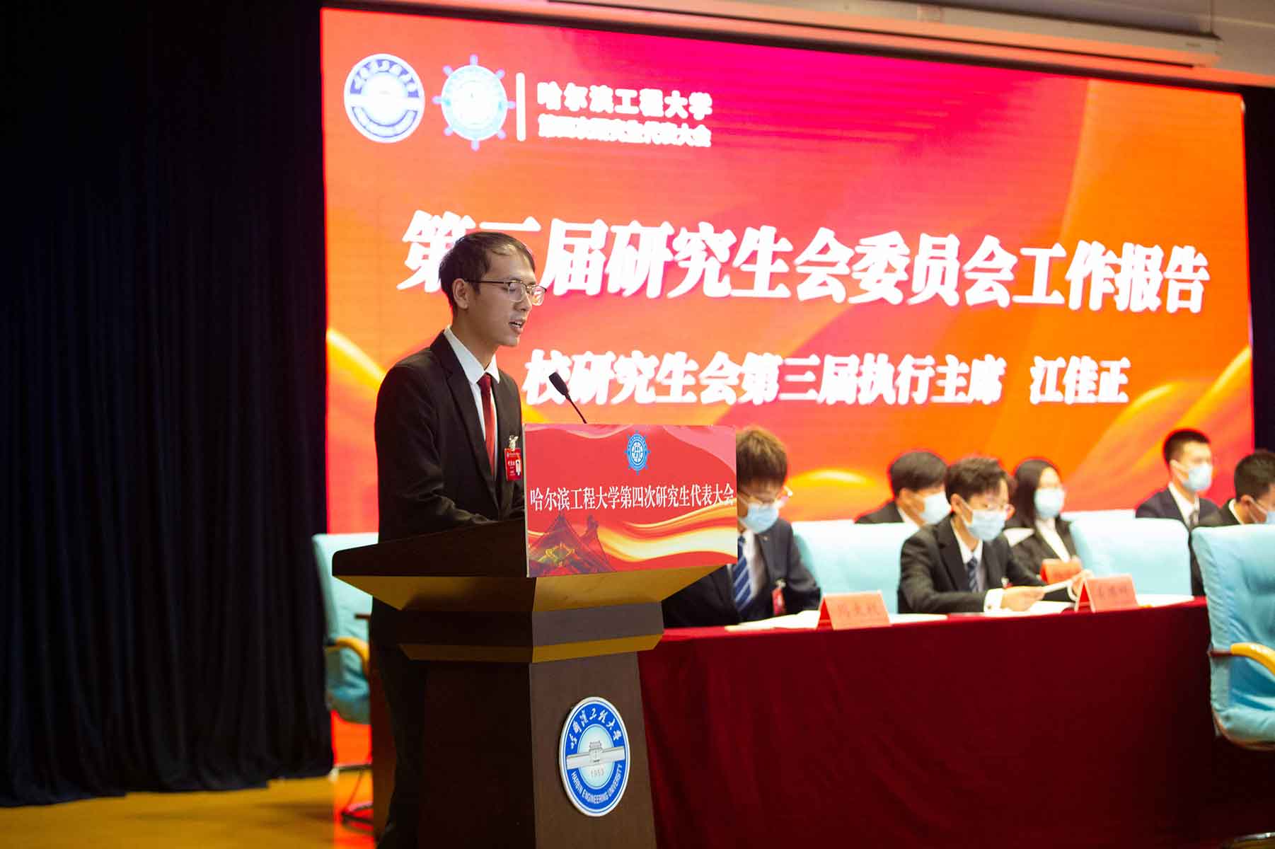 大会听取、审议并通过哈尔滨工程大学第三届研究生会执行主席江佳正所作的题为《学习二十大·青春心向党——在全面建设社会主义现代化国家的火热实践中绽放绚丽之花》的工作报告。报告回顾我校研究生会在思想政治引领、服务成长成才、维护同学权益、强化自身建设四个方面取得的成果,完成了第三次研究生代表大会确定的总体目标和主要任务。并提出校研究生会在接下来的一年中将紧扣时代主题,构建引领青年的多样化载体;践行初心宗旨,加强服务品牌的体系化建设;探索改革实措,推动研究生会的内涵式发展;更加紧密地团结在党中央周围,高举习近平新时代中国特色社会主义思想伟大旗帜,在实现中华民族伟大复兴中国梦的新长征路上奋楫笃行,在矢志奋斗中谱写新时代的青春之歌,在学校创建特色鲜明世界一流大学的航程中续写新篇章!