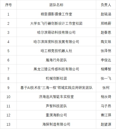 根据《关于招募哈尔滨工程大学创新创业教育实践基地学生创新创业团队的通知》,经自主申报、材料审核、专家评审等环节,现将哈尔滨工程大学创新创业教育实践基地学生创新创业团队拟入驻名单予以公示,具体团队名单如下: