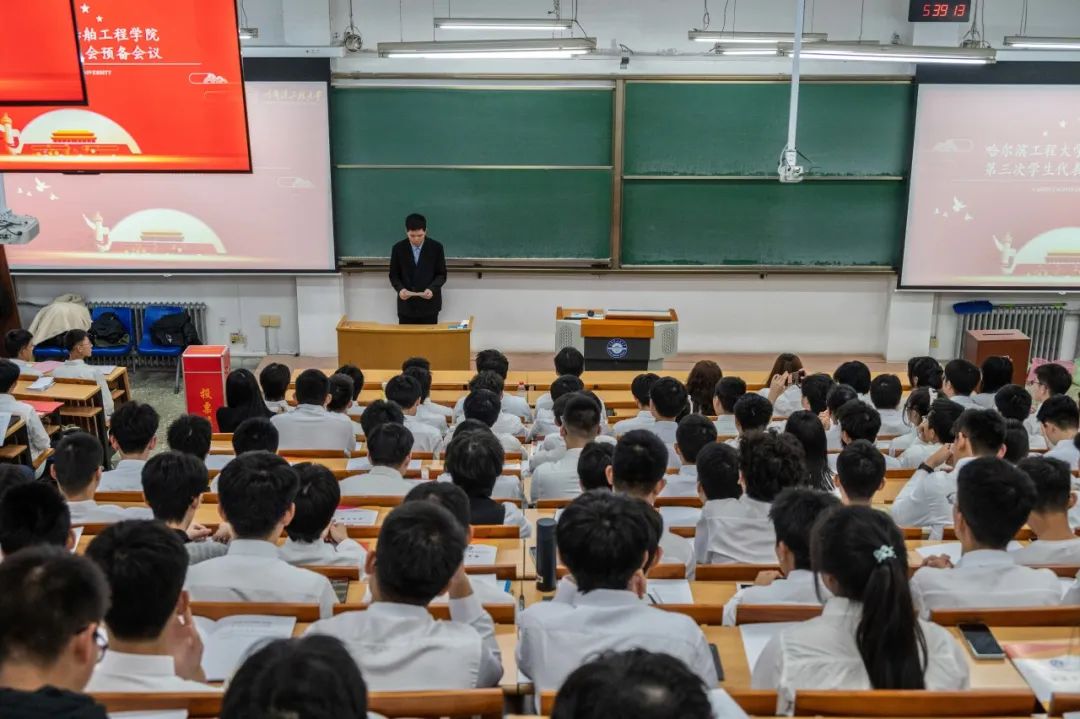 11月10日,哈尔滨工程大学船舶工程学院在逸夫楼03教室召开第三次学生代表大会。本次大会共有147名学生代表出席,船舶工程学院党委副书记王超、团委书记刘永超、辅导员苏伯原、辅导员赵欣淼等领导参加。会议主要围绕学生代表大会筹委会工作报告、代表资格审查报告、学生会选举及领导致辞等内容展开,并顺利选举产生第三届学生会委员会委员和主席团成员。