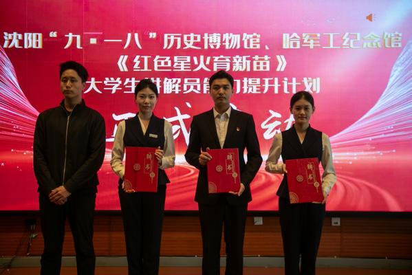 大学生志愿讲解团指导教师李泽成为沈阳“九·一八”历史博物馆宣讲团成员王浩涵、牛诗文、成思琦颁发校外指导教师聘书。三位讲解员均为行业精英——王浩涵是辽宁省五好讲解员、优秀退役军人;牛诗文荣获全省博物馆讲解员大赛第一名;成思琦多次参与国家重大纪念活动并被央视等媒体采访。他们的加入将为校园红色讲解队伍注入专业力量。