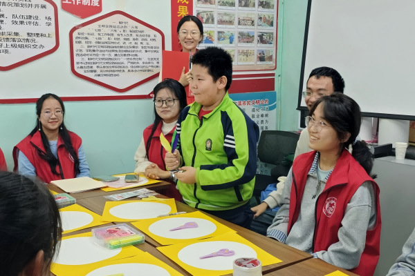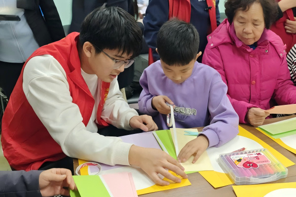 手工制作环节,15名志愿者分别担任指导人员,在活动场地内分区域为老人、儿童提供帮助。志愿者手持彩纸、黏胶、剪刀等工具,详细演示立体菊花的制作流程,帮助老人与儿童理解操作要点。在志愿者的一对一协助下,老人与儿童手持工具动手实践,通过翻转、折叠彩纸,逐步完成立体菊花制作,成品形态各异、色彩鲜艳。手工制作结束后,部分参与家庭制作重阳主题手抄报,老人凭借生活经验勾勒出山水、菊花等图案轮廓,儿童则选用红色、黄色、橙色等色彩为图案填充。
