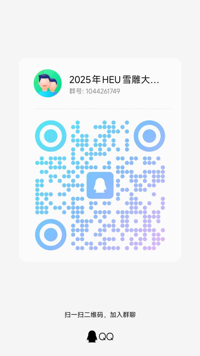 1.有意愿报名的同学扫描下方二维码填写《2026第十八届国际大学生雪雕大赛志愿者报名问卷》,并加入雪雕大赛志愿者官方QQ群(群号:1044261749,请实名制入群),填写问卷和进群两项缺一不可,同时报名即报名成功,每一位同学限报一项工作组别,不可兼报。报名时间截止至12月12日;