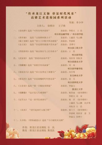 活动简介:本场演出由黑龙江省京剧院携手哈尔滨工程大学、哈尔滨金融学院、哈尔滨学院、哈尔滨商业大学、哈尔滨华德学院、东北林业大学、哈尔滨师范大学及黑龙江大学等高校共同打造。演出囊括《春闺梦》《锁麟囊》《定军山》等经典剧目选段,由专业艺术家与高校师生同台演绎,是一场展现国粹魅力与青春风采的高水平艺术盛会。