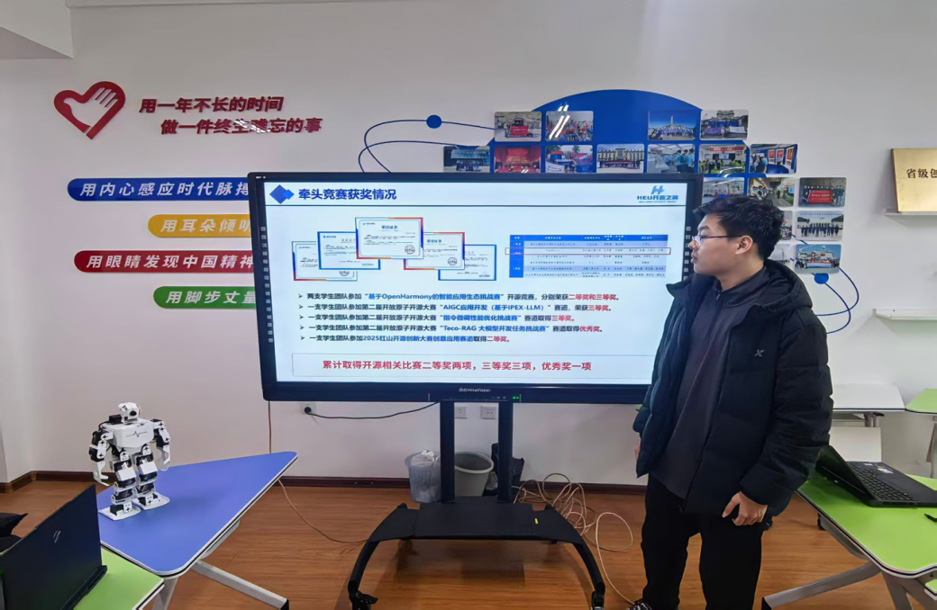 分享环节,HEU开放原子开源社团拆解竞赛项目的协作技巧与解题思路;机器人仿真协会以实物与动态演示呈现自研机器人的技术亮点和应用场景;程序设计与算法学社分享ICPC、CCPC等顶级赛事的备赛规划、训练方法与实战心得。各社团骨干共同交流,积极讨论。进一步拓展了科技类社团发展新思路。