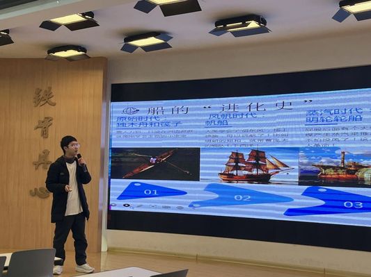 科普队副队长马偌晨则带领学生们了解船舶发展历程。从独木舟、风帆船、蒸汽船到现代核动力船舶。同时对船舶在运输、探索与国际贸易中的作用进行讲解,阐明船舶作为连接世界纽带的重要意义。