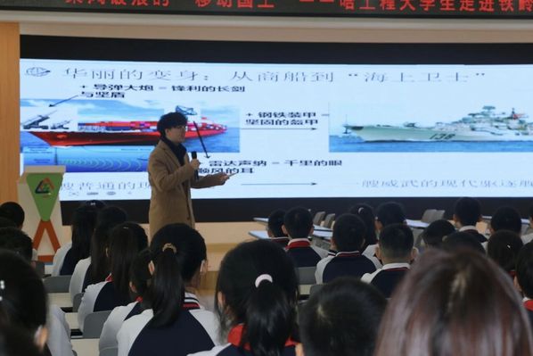 赵熙盟围绕“从运输船到海上卫士”主题,讲解军舰在海上防卫中的功能与演变,详细介绍了航母、驱逐舰、护卫舰等现代主流舰型及其核心装备,包括雷达、声纳、导弹和激光武器等先进技术,帮助学生了解军舰在海上防卫体系中承担的任务。