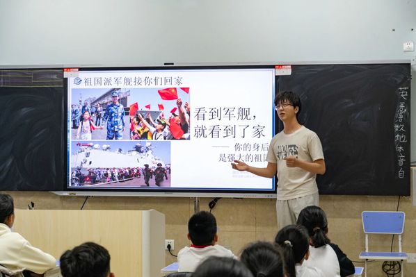 赵熙盟与赵然在六年八班围绕“军舰为何是移动的国土”进行讲解,从陆地界碑与长城引入,通过问答与学生交流对祖国的认识,阐释军舰在维护国家海洋主权中的作用,并结合南海巡航、也门撤侨等实例,说明军舰代表国家主权与尊严的意义。