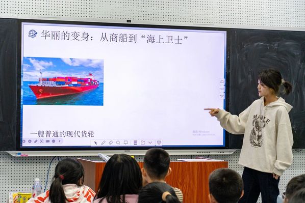 丁祉奕与李艾格在六年十班介绍船舶发展历程,从独木舟、帆船、蒸汽船到现代核动力船舶,讲解船舶在运输、贸易与国防中的作用,说明船舶技术演进与国家发展的关联。学生现场分享所学船舶知识,参与互动。