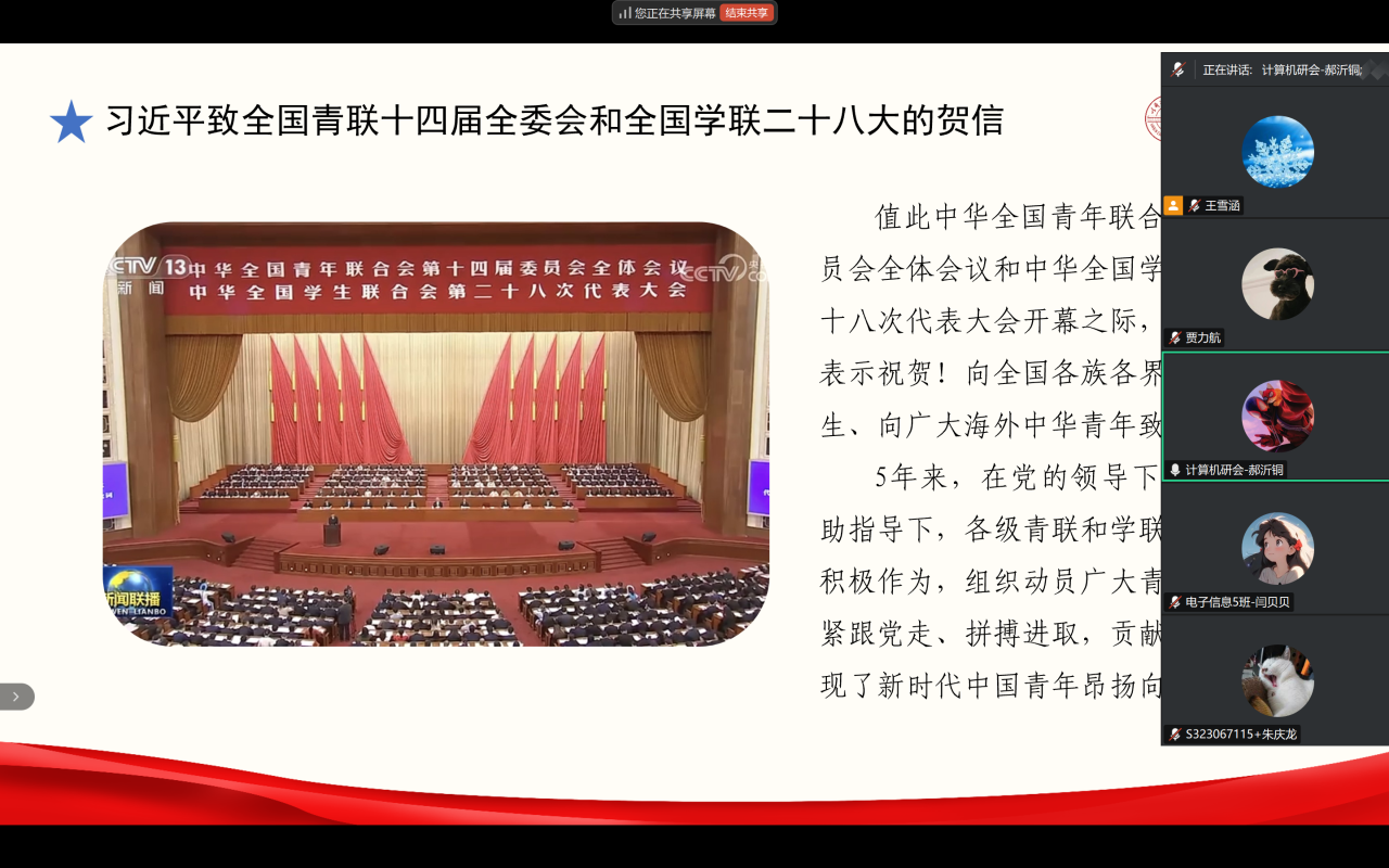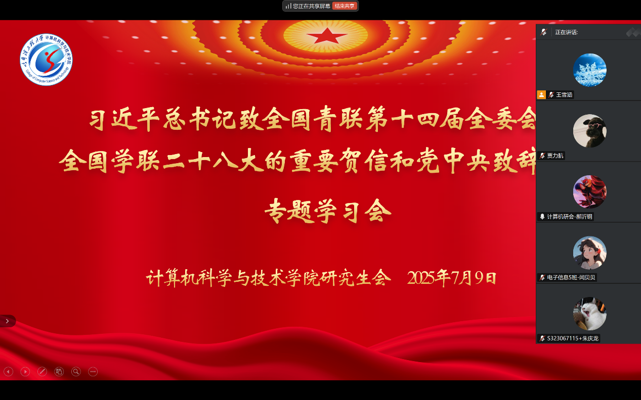 7月9日,计算机科学与技术学院通过腾讯会议线上平台组织开展“习近平总书记致全国青联第十四届全委会、全国学联二十八大的重要贺信和党中央致辞精神”主题精神专题学习会,深入学习贯彻习近平总书记致全国青联第十四届全委会全国学联二十八大的重要贺信和党中央致辞会议精神。