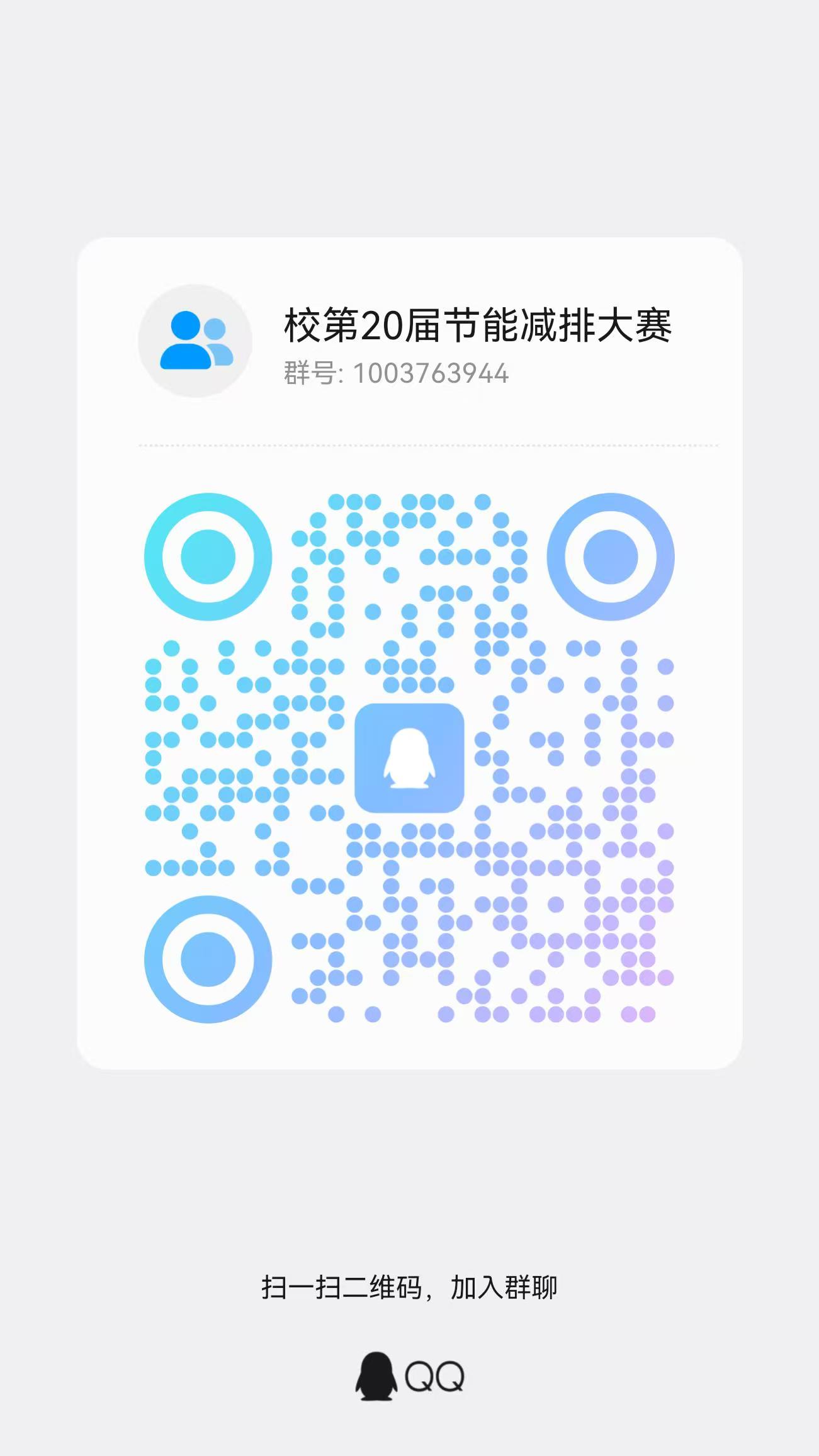 各参赛队伍于校赛举办时间之前(预计2026年4月举办),将竞赛报名表、作品申报书及作品说明书打包发送至邮箱:3037226693@qq.com,命名格式为“类别+项目名称+负责人+联系方式”,如“A类+节能减排竞赛样例+张三+136xxxxxxxx”。参赛成员需加入节能减排大赛微信群(群二维码见下图),比赛的相关信息会在群内及时公布。
