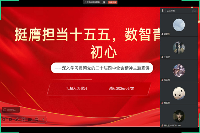 为深入学习贯彻党的二十届四中全会精神,引导青年学子把握数智时代发展机遇,树立挺膺担当的时代使命,进一步提升青年学生的政治素养与专业使命意识,信息与通信工程学院团委于3月3日通过腾讯会议线上平台组织开展“党的二十届四中全会精神”主题精神专题学习会。
