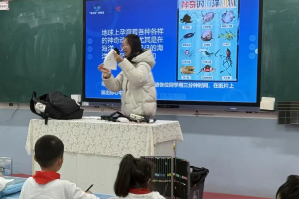 课堂上,志愿者围绕海洋资源展开讲解,介绍海洋矿产、能源及生物资源,帮助学生了解海洋的丰富内涵;同时通过图文结合的形式,展示深海鱼类、珊瑚等海洋生物,带领学生认识海洋生态。