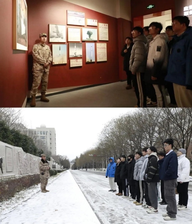 研学团先后参观了火箭军工程大学校史馆、兵器陈列馆与校园文化墙。在校史馆,同学们通过珍贵的史料与实物,重温学校伴随我国导弹事业从无到有、由弱至强的发展历程,深刻体悟到一代代火箭军人扎根奉献、矢志攻坚的忠诚与担当。兵器陈列馆内,丰富的导弹装备模型与讲解,生动展现了我国战略威慑力量的建设成就,使同学们对国家尖端国防科技有了更为直观和震撼的认识。校园文化墙上,砺剑精神、忠诚铭训等主题展示,让同学们深刻感受到火箭军特有的精神文化传承。