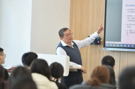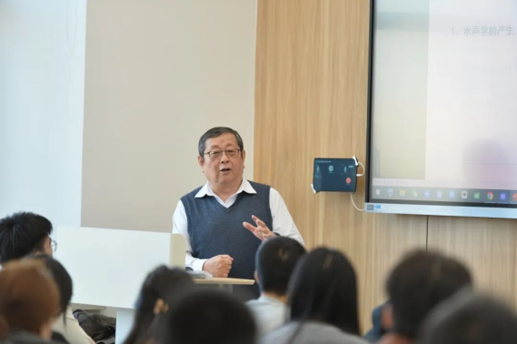 课堂上,杨德森打破公式教学的枯燥感,以通俗语言阐释水声学的“工程性”与“硬核价值”。“中学学习的公式里,x、y、z通常求解出来都是固定的,而学习水声后,你会发现,很多都是变量,声压随时间、空间变化而产生波动,每一处波动都是全新的科研挑战。”他引导学生完成从理论到实践的思维转变,串联学科发展脉络、世界水声发展历程与重大突破,结合自身四十余年科研经历,详解水声学在认识海洋、经略海洋、深海勘测中的核心作用。
