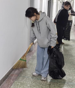 12月1日,志愿者在十三公寓按楼层划分小组,对楼道、走廊、楼梯等区域依次开展清扫、拖洗与死角清理。12月10日,志愿者在五公寓对公共走廊、主楼梯、侧边楼梯等高频使用区域进行深度清洁,在公寓工作人员指导下,对洗漱间、卫生间等易积垢位置开展专项清理。