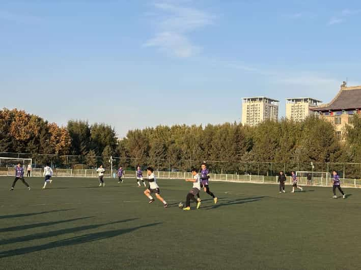 秋日暖阳下,澄澈蓝天与金黄树叶相映,足球赛事正式拉开帷幕。绿茵场上,队员们全力驰骋、奋勇争锋:有人带球突破,以娴熟技巧甩开防守;有人精准卡位,用坚韧意志筑起防线;有人全力追防,不顾体能消耗全力奔跑。每一次激烈拼抢、每一次精准配合,都展现着队员们不畏挑战、奋勇争先的体育精神,让现场充满热血与活力。