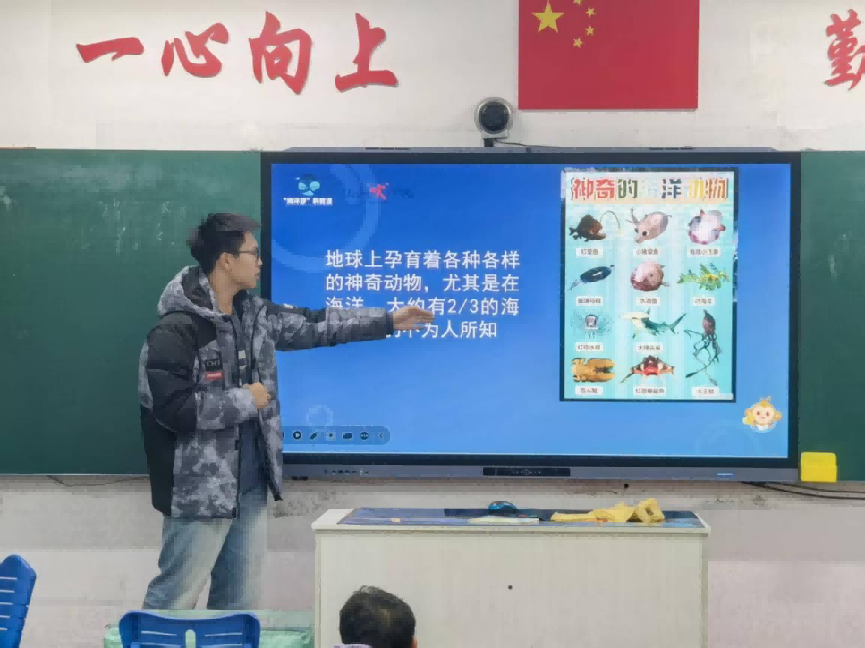 在赵一曼红军小学,志愿者们从“海洋里有多少宝藏”切入,通过南海石油、天然气和可燃冰等资源存量的具体数据,诠释海洋作为“蓝色粮仓”和“资源宝库”的重要价值。