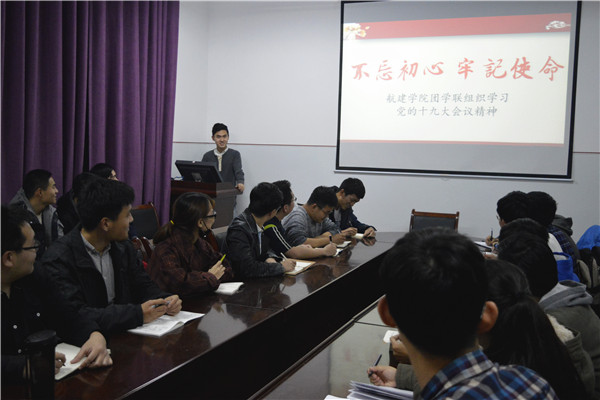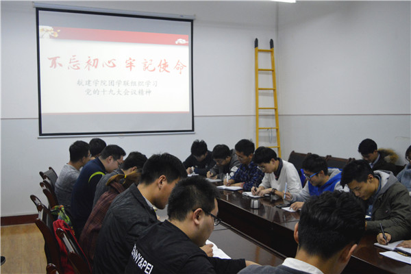 11月7日晚9时10分,航建学院团学联组织主题为“不忘初心,牢记使命”的党的十九大会议精神学习活动。航建学院团学联全体学生干部参加本次活动,团委常务副书记周博成担任主持人。