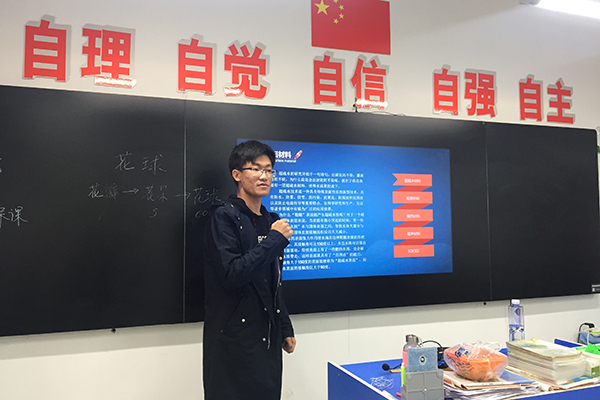 活动开始,闵译萱通过互动环节提问同学们“什么是材料”,同学们举手回答,说出自己的答案,闵译萱对常见材料与高新材料进行比较,为同学们介绍高新材料的概念和作用。