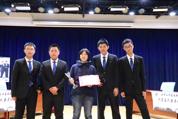机电工程学院辩论队获得了本次新生辩论赛的冠军。评委老师依次给最佳贡献院系,十佳辩论导航员,最佳辩手及各获奖队伍颁奖,合影留念。