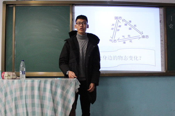 在校青协部员的带领下,志愿者来到所要教学的班级,并布置好需要的实验用具。志愿者们为南直小学的同学们讲解有关物态变化的基础知识。为提高课堂气氛,志愿者采用有奖问答对同学们以前学过的知识进行提问,回答正确的同学即可挑选小礼物。志愿者为同学们演示物态变化的实验,将相关知识形象的的告诉同学们,这为他们留下了深刻的的印象。下课铃响,本次教学活动结束。