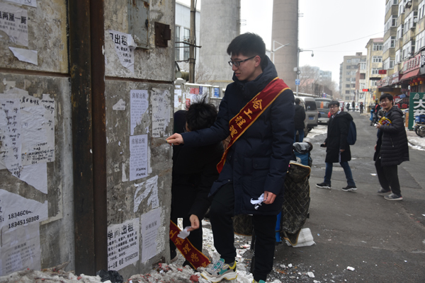 3月12日10时30分,理学院手拉手志愿服务队于学校十一公寓附近区域举行“学雷锋——清理小广告”活动。活动由理学院团委社会实践部部长冀旭浩带队,共有二十余名志愿者参加此次活动。