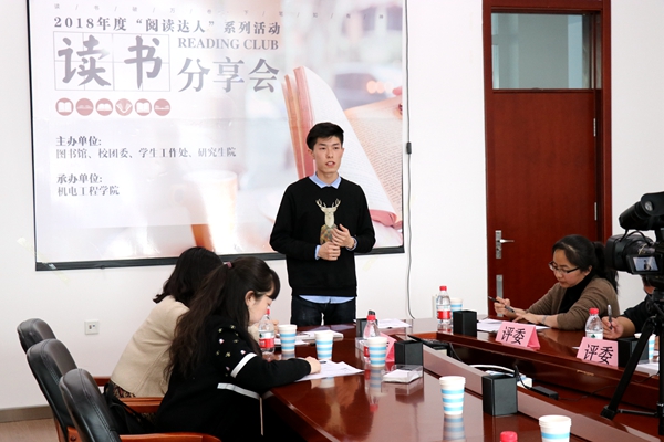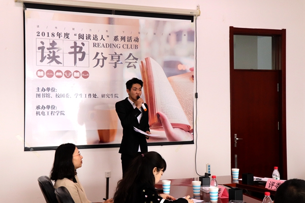 4月8日8时30分,机电工程学院于图书馆612会议室开展“阅读达人”读书分享会。机电工程学院党委副书记牟道富、图书馆副馆长陆萍、机电学院辅导员齐云鹤和房帅出席分享会,工程训练中心老师周莹、人文学院老师赵岩、图书馆指导老师吴丽坤担任评委,段家豪担任主持人。