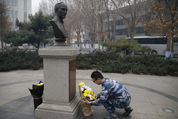 志愿者们全体默哀,缅怀先烈功绩。主持人介绍奥列霍夫中将的事迹,海魂志愿者们为先烈献花,学生代表张啸威上前发言,表达对先烈无私无畏精神的崇高敬意,同时鼓励大家要传承军工人艰苦奋斗的精神。志愿者们瞻仰奥列霍夫雕像,当遇到上前询问的路人时,志愿者们耐心讲解。